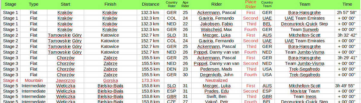 Cycling men race: Tour de Pologne -complete stage statistics and general placement: stage winners, mountain goals, team results…